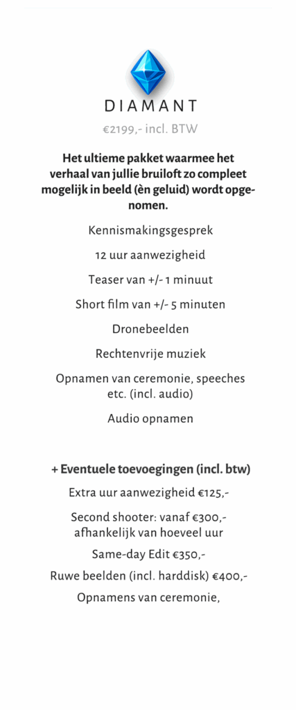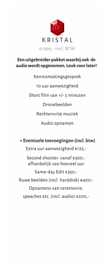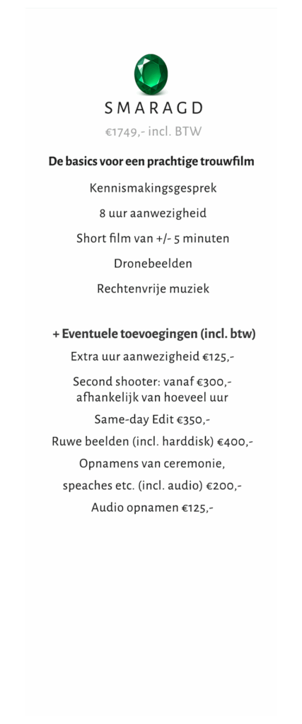 Bij mij kun je kiezen tussen een van de drie pakketten. Het basistarief kost €1749,-. Uiteraard kunnen jullie ervoor kiezen om extra opties toe te voegen. Zoals een tweede videograaf, same-day edit of alle ruwe bestanden. Bij elk pakket komen er steeds meer toevoegingen bij. Zo verschillen de kosten bij elke trouwvideo en kunnen jullie een passend pakket samenstellen.